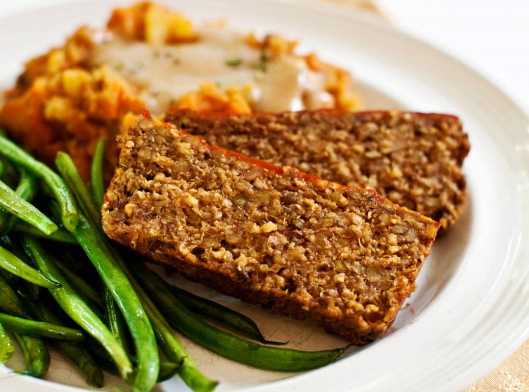 Remojá ½ kg de lentejas y luego hervirlas hasta que estén casi cocidas, evitando que se pasen. Por otro lado salteá con oliva 2 cebollas, 4 dientes de ajo, 1 morrón rojo, 3 zanahorias, 1 rama de apio y 1 de puerro. Coladas y tibias procesá las lentejas dejando que queden algunas apenas partidas. Agregá el salteado, 2 huevos y ½ taza de fécula de mandioca, batí y condimentá con sal, pimienta negra, orégano fresco, pimentón dulce y cúrcuma. Ahora aceitá un molde de budín volcá la masa dentro, espolvoreala con germen de trigo o queso rallado y cocinala en horno moderado durante ½ hora. Para el puré pelá 1 kg de mandiocas, cortalas, hervilas en agua sin sal hasta que se ablanden, colalas, pisalas y condimentalas a gusto. Para servir la terrina cortala en rodajas de 2 cm, colocá las rodajas sobre el puré de mandioca y antes de servirlas salseala con una emulsión procesada de oliva, 2 dientes de ajo, perejil y hojas de albahaca.